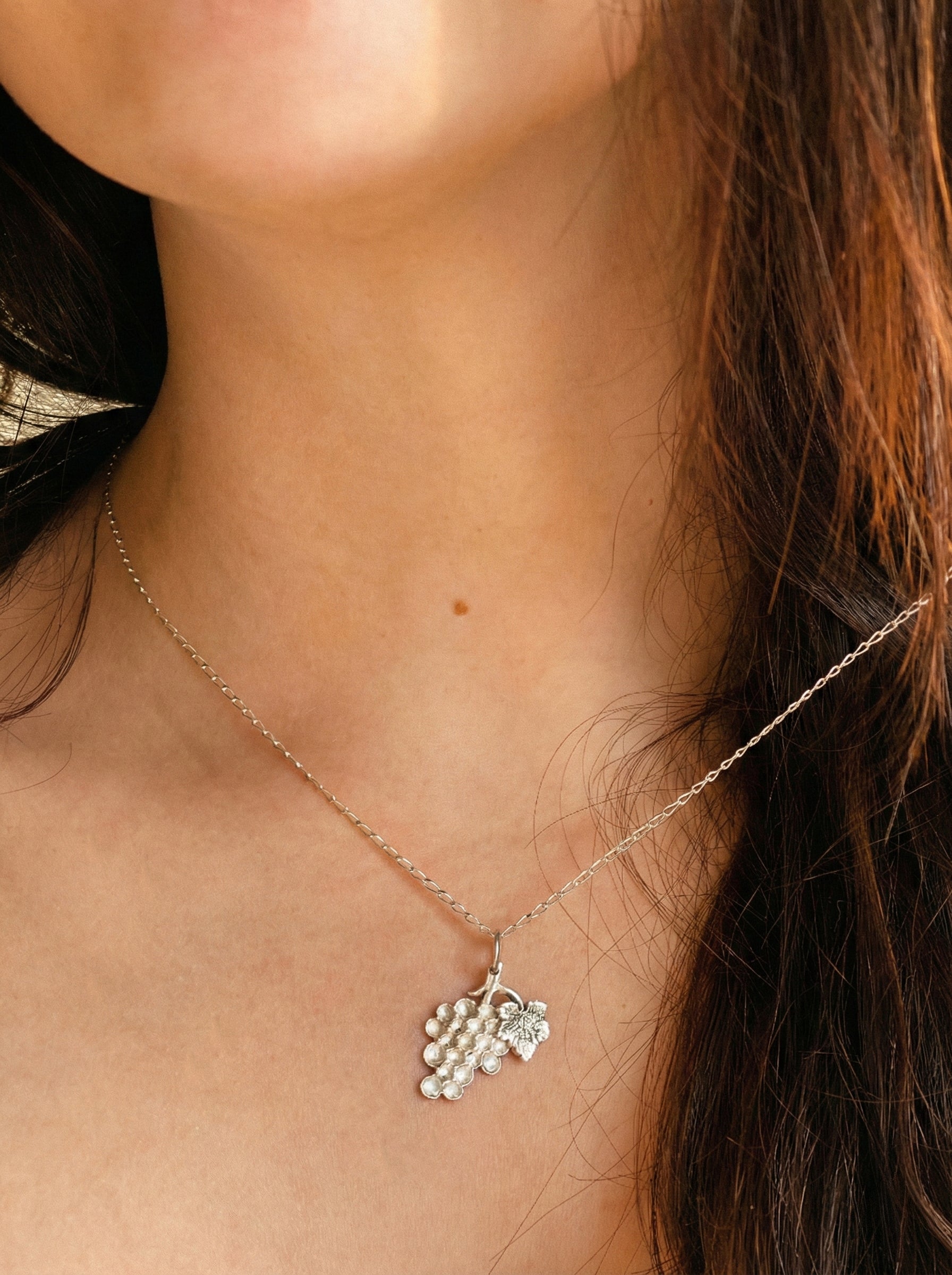This grape cluster pendant is a beautiful study in texture and shape. It carries an earthy, vintage charm that feels like a summer afternoon in a sun-drenched vineyard preserved in silver.