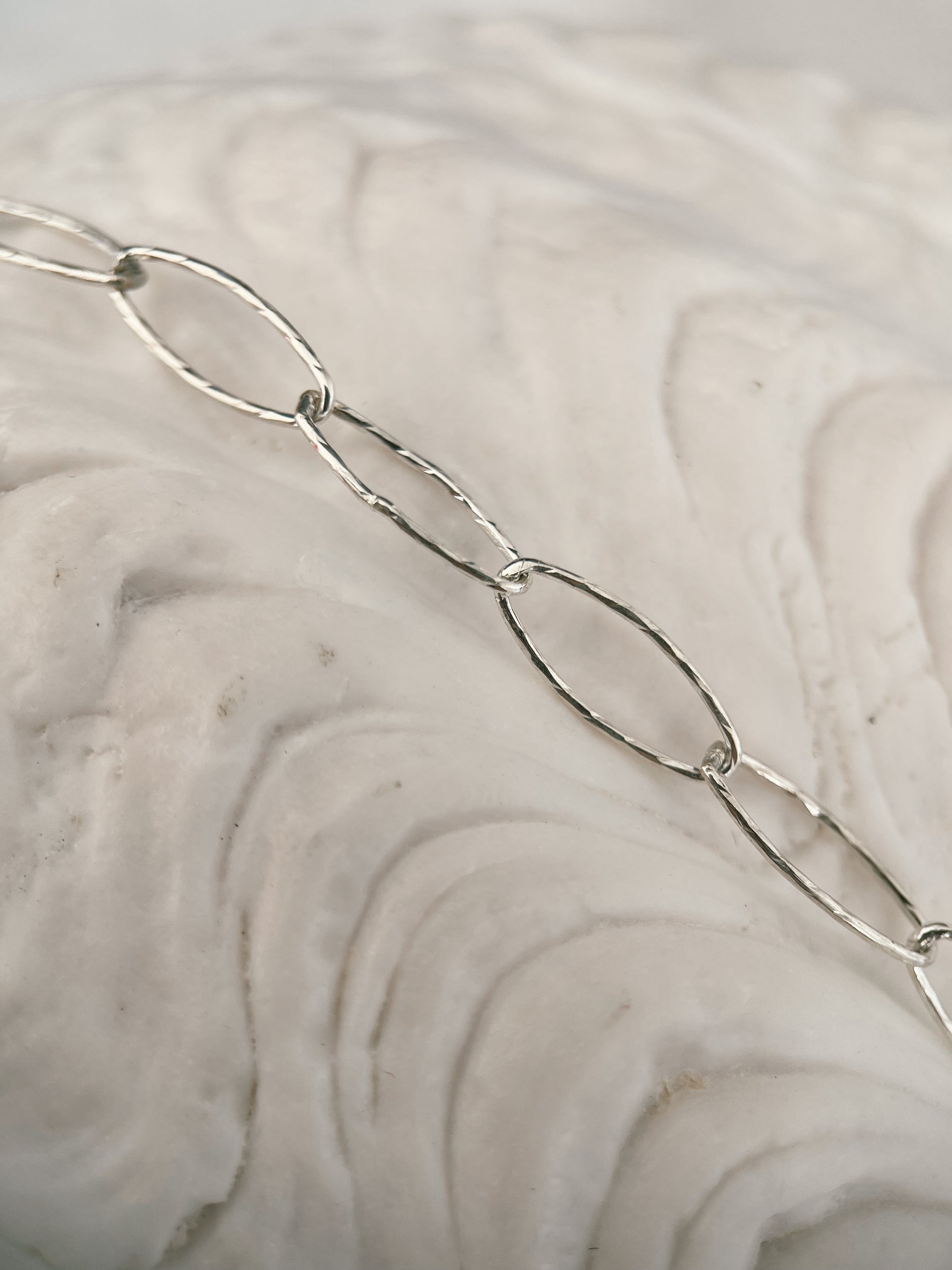 Simple textured oval paperclip chain made of solid steerling silver, lightweight and shiny with a lobster clasp closure.